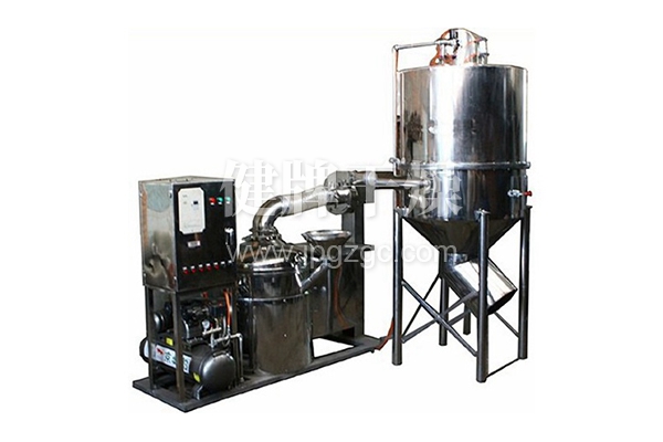 本機工作原理和傳統中醫研船,腳踏碾輪粉碎原理相同。碾輪在軌道上圓周滾動(dòng),加上適當壓力,在反復碾軋的過(guò)程中使物料粉碎并達到需要的細度。由于碾輪雙邊刃口有剪切作用,也協(xié)同粉碎,特別是纖維性物料。粉碎過(guò)程中細的物料飄浮起來(lái)被風(fēng)機吸入,排到旋風(fēng)集料罐,布袋排出氣體,成品料粉留在袋內。