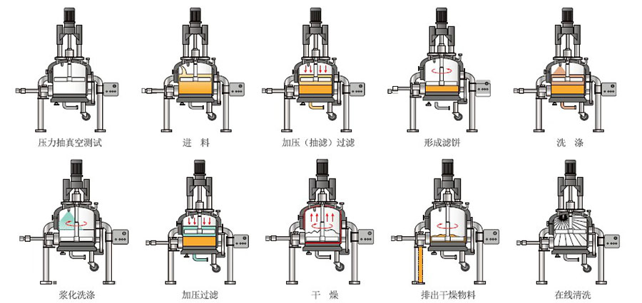 該過(guò)濾、洗滌、干燥 “三合一設備”,可以同時(shí)替代過(guò)濾及干燥設備(抽濾器、壓濾器、雙錐干燥器、干燥箱等) 。在同一臺設備內完成過(guò)濾、洗滌、干燥、固體卸料全過(guò)程。廣泛應用于醫藥、化工、農藥、食品等行業(yè),是過(guò)濾干燥的一體化設備 ??蓪?shí)現全封閉、全過(guò)程的連續操作生產(chǎn),更適應于無(wú)菌要求的產(chǎn)品及有毒產(chǎn)品的生產(chǎn)。
