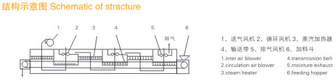 物料由加料器均勻地鋪在網(wǎng)帶上,網(wǎng)帶一般采用12-60目不銹鋼絲網(wǎng),由傳動(dòng)裝置拖動(dòng)在干燥機內移動(dòng)。干燥機由若干單元組成,每一單元熱風(fēng)獨立循環(huán),部分尾氣由專(zhuān)門(mén)排濕風(fēng)機排出,廢氣由調節閥控制,熱氣由下往上或由上往下穿過(guò)鋪滿(mǎn)物料的網(wǎng)帶完成熱量與質(zhì)量傳遞的進(jìn)程,帶走物料水份。網(wǎng)帶緩慢移動(dòng),運行速度可根據物料溫度自由調節,干燥后的成品連續落入收料器中。上下循環(huán)單元根據用戶(hù)需要可靈活配備,單元數量亦可根據需要選取。